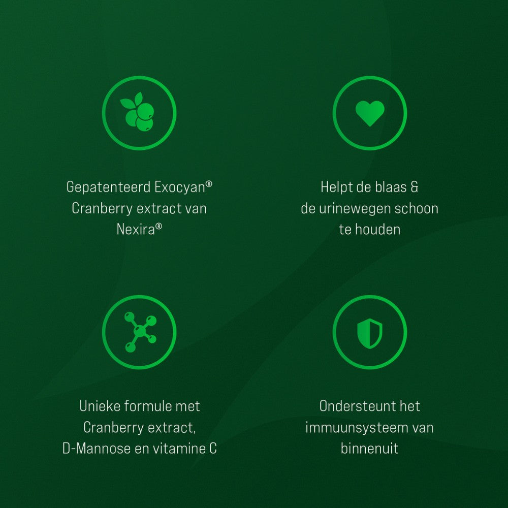 Blaas & Urineweg is een hoogwaardig voedingssupplement dat zorgvuldig is samengesteld met Exocyan® Cranberry Extract, D-mannose en Vitamine C. Deze unieke combinatie helpt de blaas schoon te houden en is goed voor de weerstand van de blaas en urinewegen.