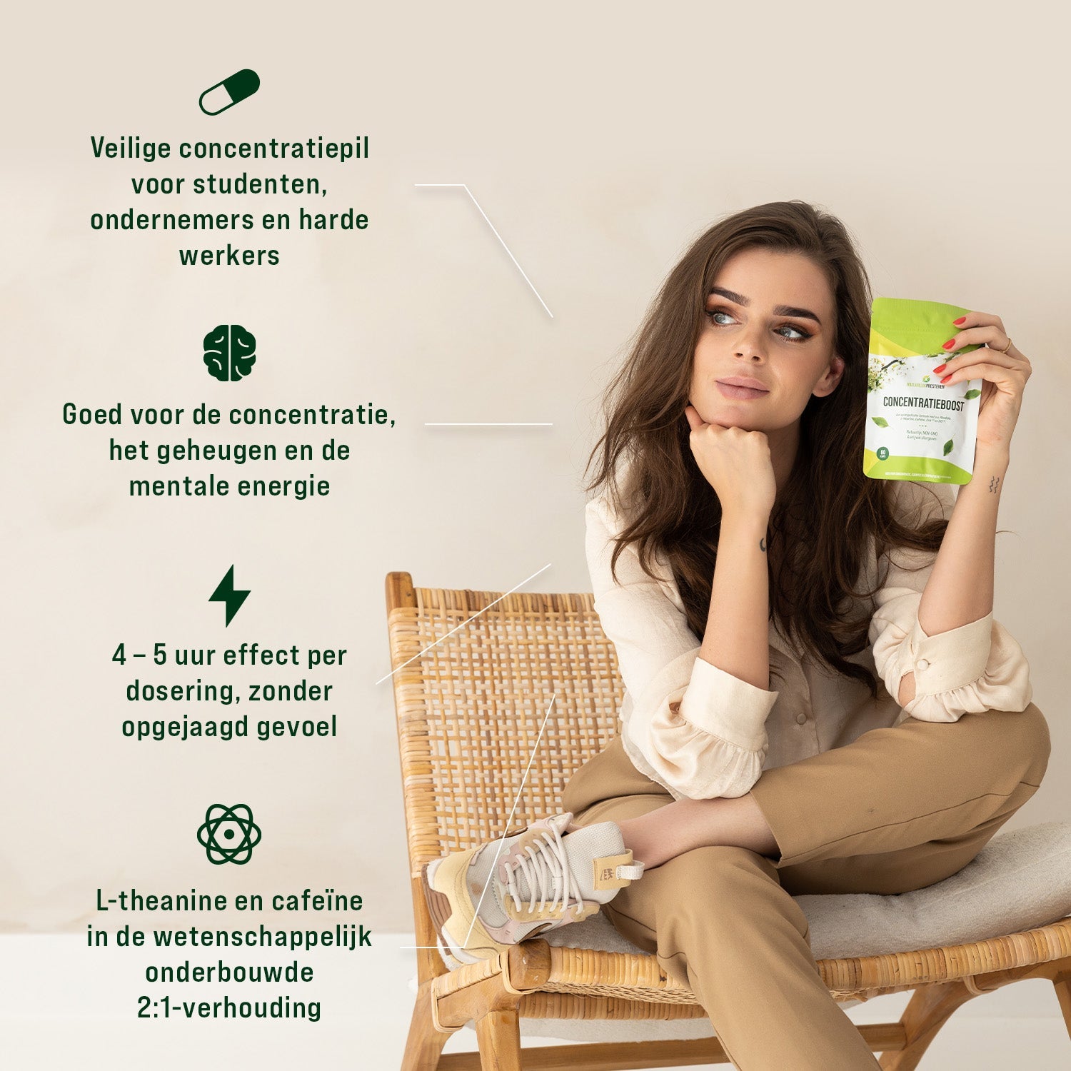 Focus is belangrijk voor het behalen van doelen. Dit kan een belangrijke deadline zijn, of een moeilijk tentamen. Concentratieboost is goed voor de mentale energie, helpt je focussen en ondersteunt het functioneren van het brein*
