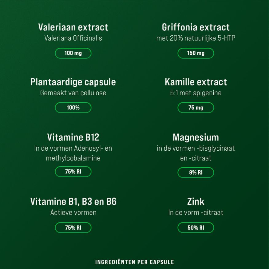 Ons slaapmiddel bevat het rustgevende stofje Kamille in extract vorm (5:1) en een valeriaan extract van hoge kwaliteit. Allebei in een veilige dosering, zodat je niet duf wakker wordt.