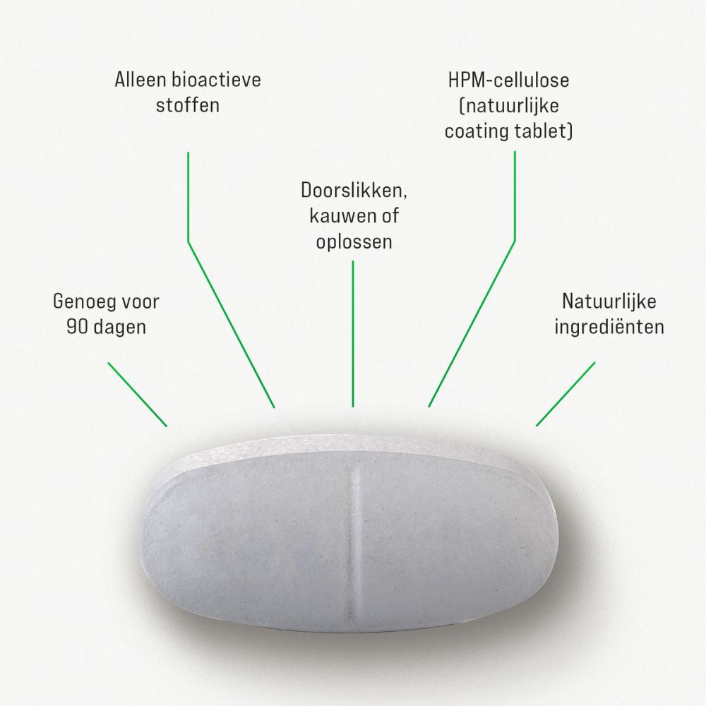 1 – 3 tabletten per dag innemen met een ruime hoeveelheid water. Na een maaltijd en eventueel verspreiden over de dag.