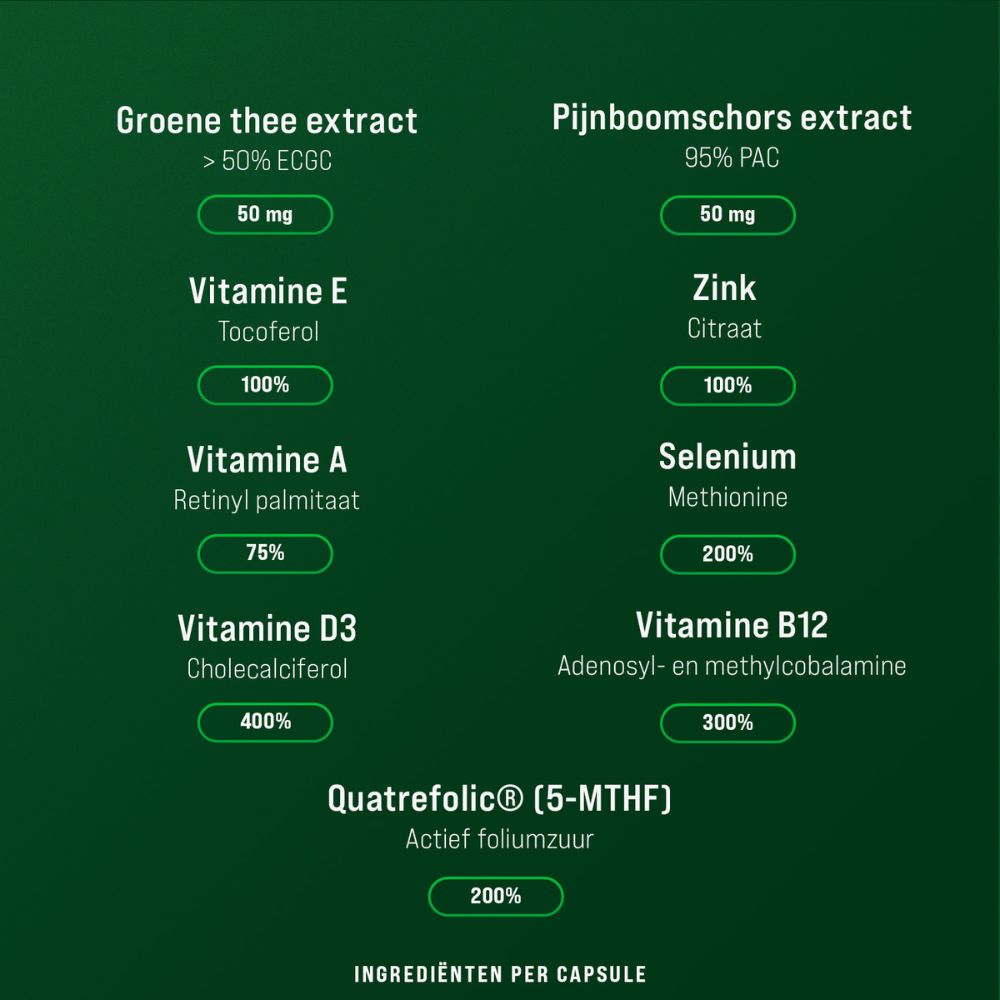 “Bescherming en Doorbloeding” Complex – Groene thee & Pijnboomschors extract, vitamine E en vitamine A.