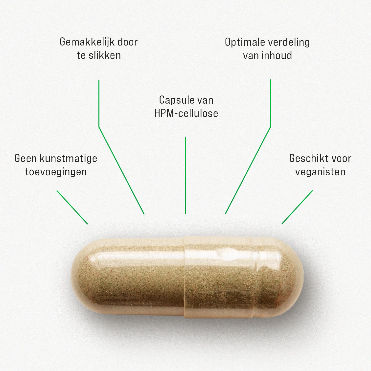 HPM-cellulose (natuurlijke capsule), MCT-poeder uit kokos en rijstvezelextract (natuurlijke antiklontermiddelen).